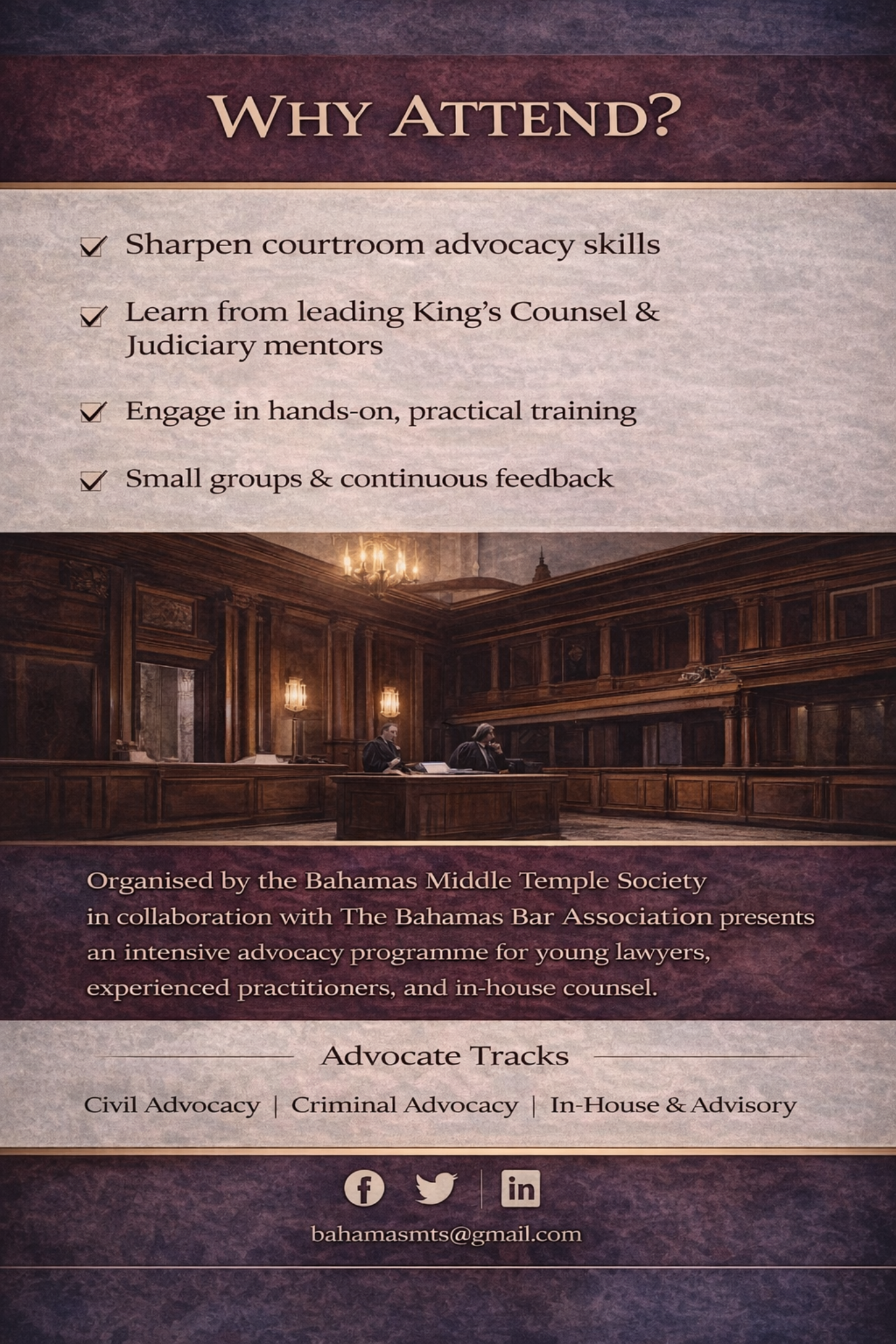 Distinct learning tracks tailored to your practice: Civil Advocacy, Criminal Advocacy, and In‑House & Advisory Advocacy.